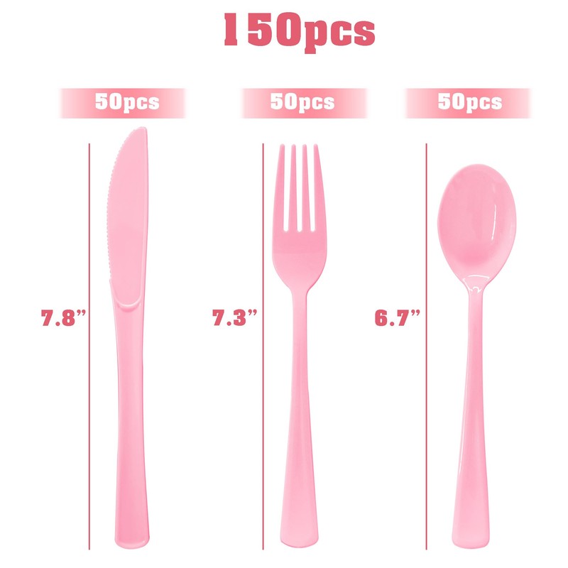 - 【Cost-Effective Pink Utensils】: This pink cutlery includes 50 pink plastic forks, 50 pink spoons and 50 pink knives, total 150 pink plastic cutlery. Not only does it provide customers with sufficient quantities that can be easily replaced when needed, ensuring hygienic and convenient dining, but it is also more affordable.