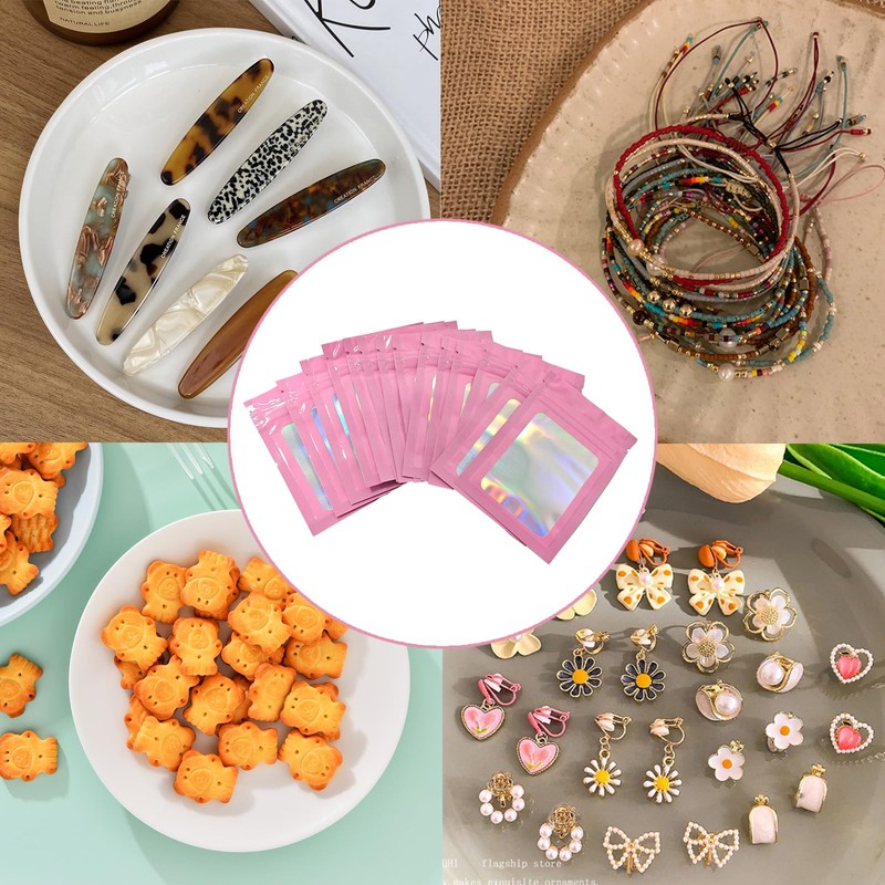 150 Pcs Foil Ziplock Bags Set, 10 * 7CM Resealable Mylar Bags, Smell Proof Holographic Pouches for Food, Jewelry(Pink)