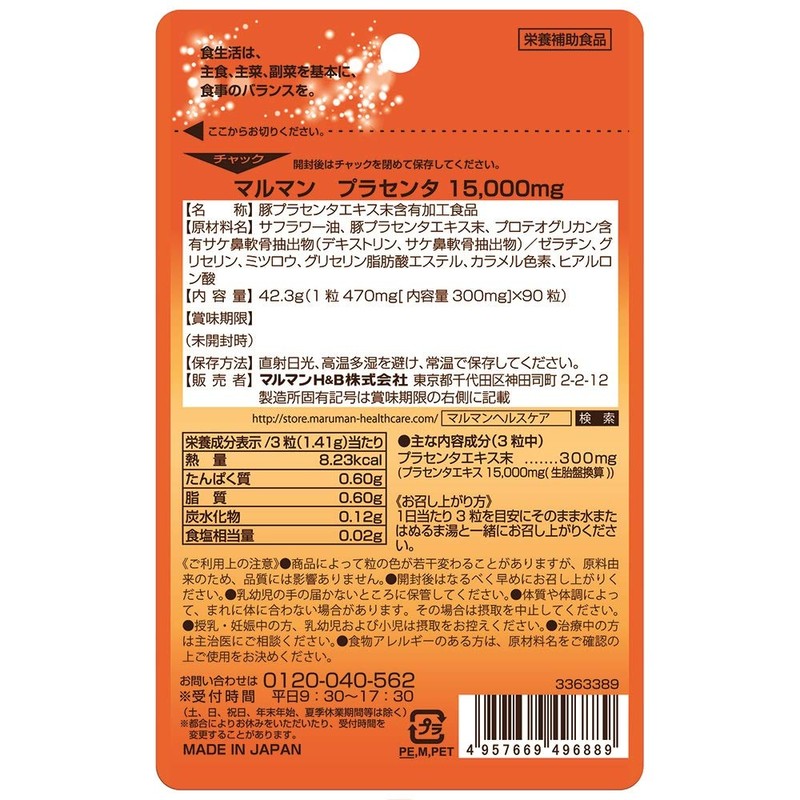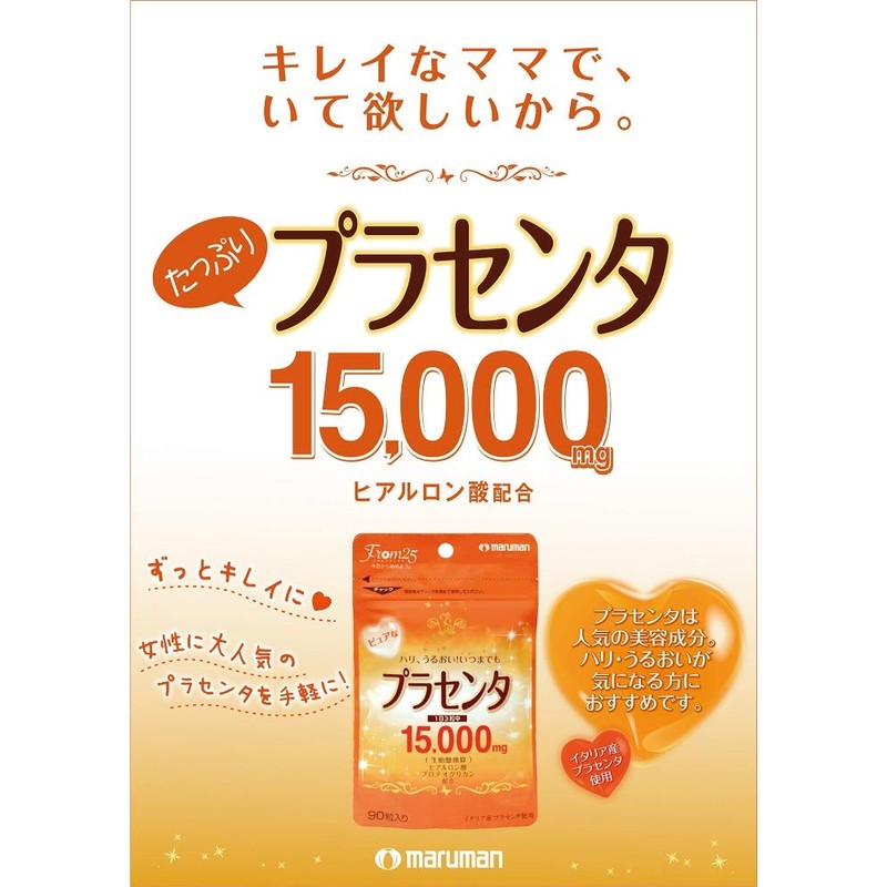 - 栄養成分 : 栄養成分表示/3粒(1.41g)当たり 熱量8.23kcal、たんぱく質0.60g、脂質0.60g、炭水化物0.12g、ナトリウム.70mg、プラセンタエキス15000mg(生胎盤換算)(プラセンタエキス末・・・300mg)
