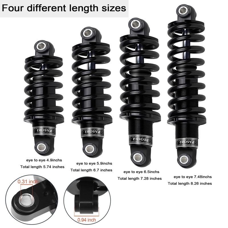 - Product Specifications: Mountain bike shock absorbers, eye to eye 125mm/4.9inchs,150mm /5.9inchs, 165mm /6.5inchs,190mm/7.48inchs; Load capacity: 350lbs/650lbs/850lbs/1000lbs/1500lbs.