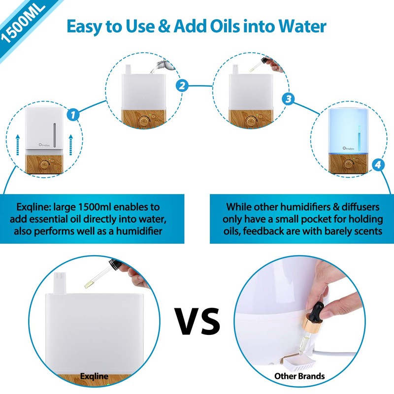 - [Super Large Capacity & Longer Running Time] - 1500ml (almost 1/2 gallon) water capacity of Exqline large essential oil diffuser supports over night operation with a full tank of water (up to 10-20 hours working time). No need to fill water as often as using other smaller capacity essential oil diffusers.