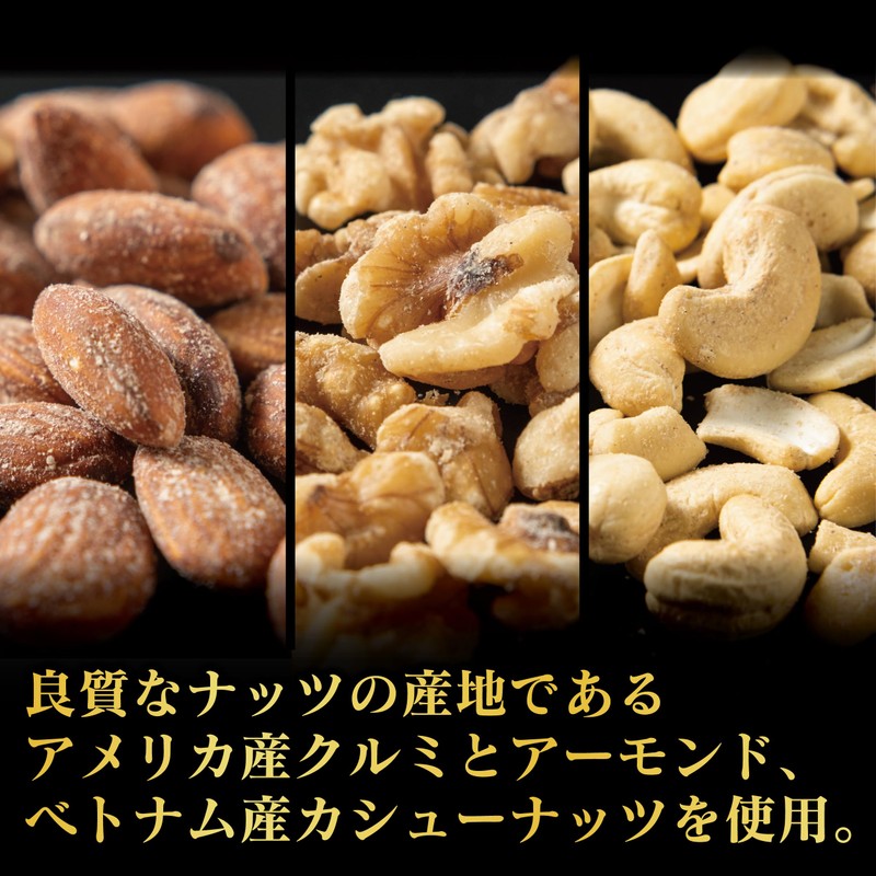 良質なナッツの原産地であるアメリカ産クルミ、アーモンド、ベトナム産カシューナッツを使用し、そのままでも美味しいところを薫り高いトリュフシーズニングで味付けしたトリュフミックスナッツです。