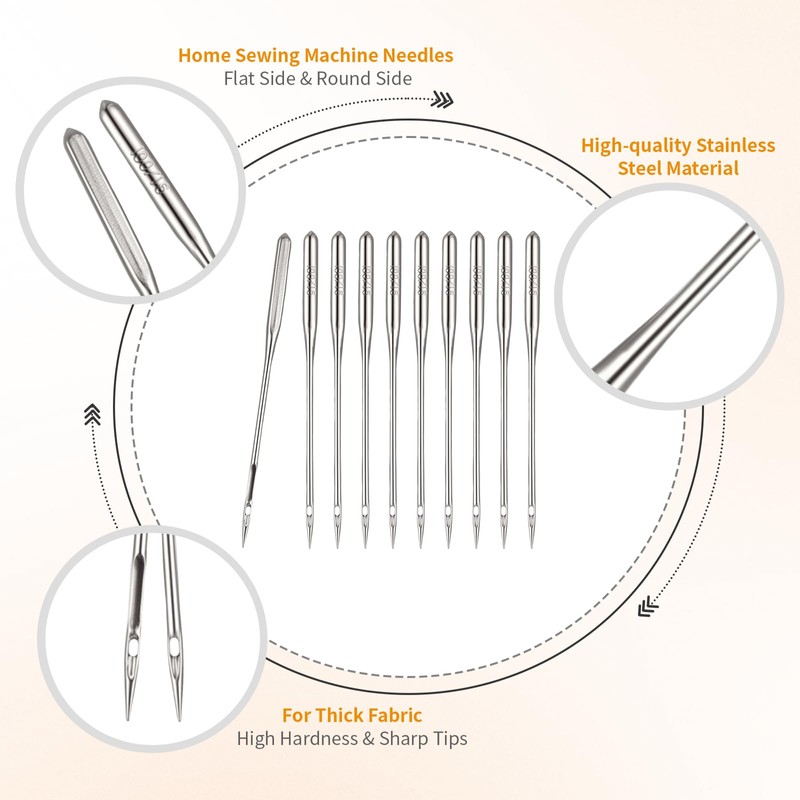 - [SHANK DESIGN]The top of the heavy duty sewing needles is designed with one flat side and one round side, making our sewing accessories suitable for standard flat shank home sewing machine heavy duty.