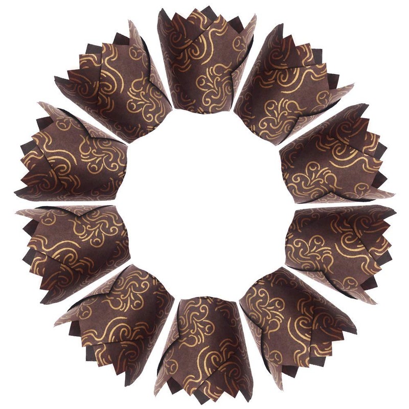 **Tulip cupcake liners, ideal presentation for muffins, cupcakes, and other baked goods. Bring you a different kind of sweet.** **Tulip Baking Paper cups specification** Material: Grease-proof, natural food grade paper Standard Size: 2.0x 2.0 x 3.2 inch (bottom x top x height) Color: Brown Design: Golden stripes printed **Muffin/Cupcake Liners features:** ♥Each batch of goods may comes with slightly different color ♥Suitable for oven, microwave ♥Graceful and festive way to dress up your cupcakes and muffins ♥Perfect for your theme party. **Package includes:** 150Pcs Brown Tulip Muffin/Cupcake liners