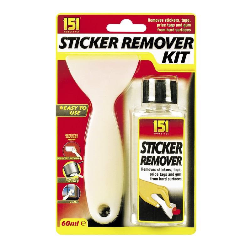 - CLEAN HARD SURFACES: 151 Sticker Remover Kit, removes sticky residue left by stickers, tape, gum and price tags from hard surfaces inlcuding paint, wood, glass and kitchen utensils.