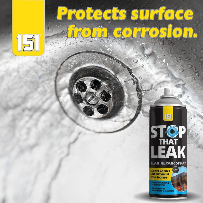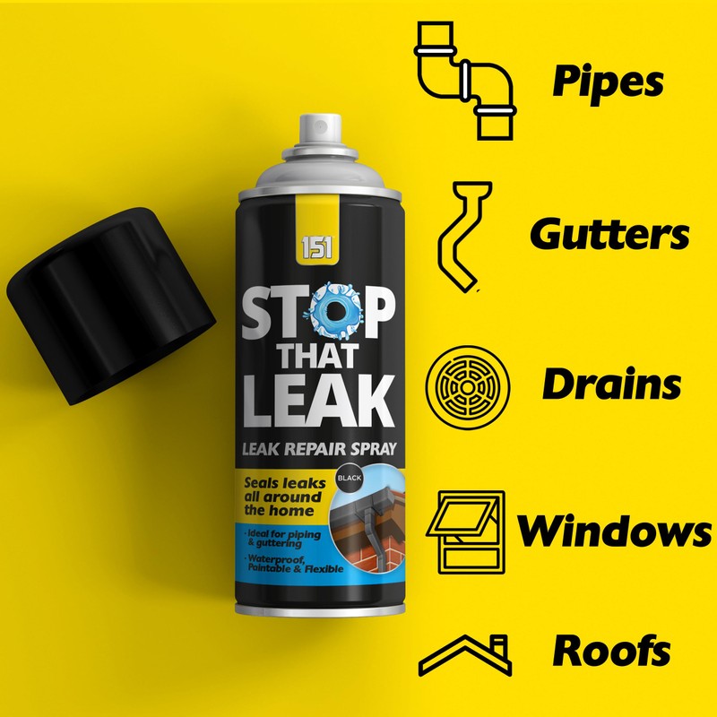 - REPAIR BLACK PIPES & GUTTERING: 151 Stop That Leak Repair Spray, quickly and easily spray black drain pipes, guttering, windows and roofs for an easy seal option to annoying leaks.