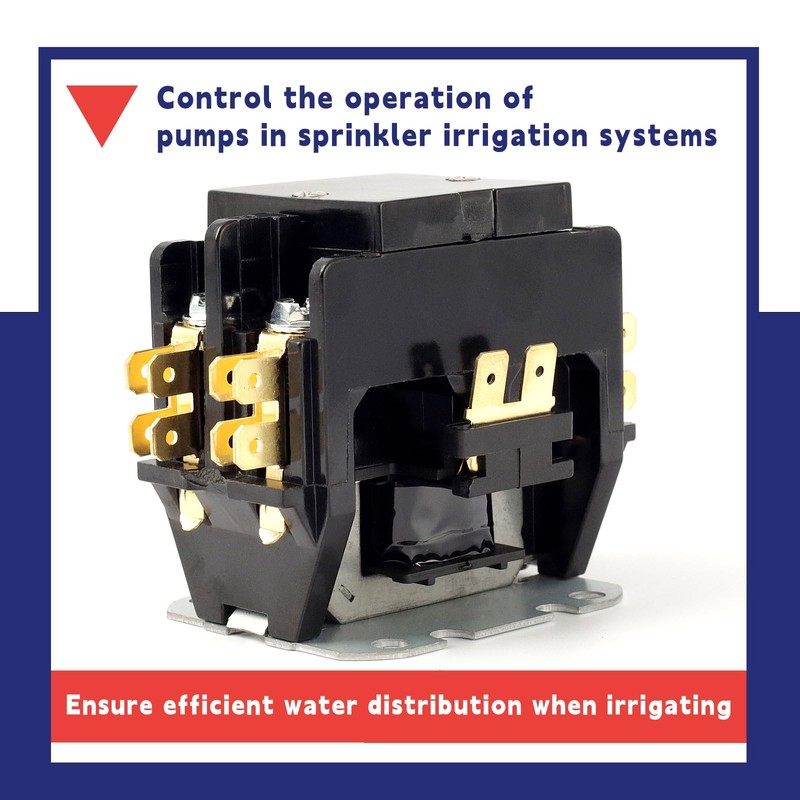 The contactor serves the purpose of powering on, disconnecting the suction coil, maintaining and protecting the coil circuit, and controlling the operation of a pump in a sprinkler irrigation system.
