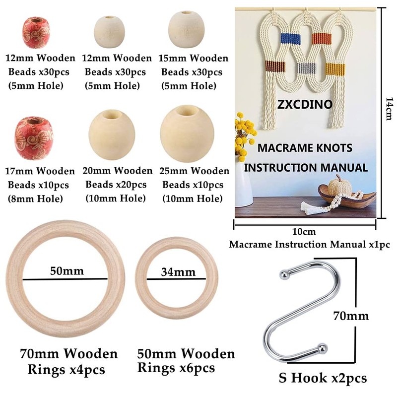 - Macrame Supplier Kit : 152pcs Package includes 1 roll 3mm x 220 yard macrame cord, 1pc macrame knot instruction manual, 4pcs wooden sticks (2pcs 10mmx15cm & 2pcs 10mmx20cm), 10pcs wooden rings (6pcs 50mm & 4pcs70mm), 90pcs wood beads (30pcs 12mm,20pcs 15mm,20pcs 20mm and 10pcs 25mm), 40pcs painted wood beads (30pcs 12mm & 10pcs 17mm), 2pcs gold metal craft hoops (6inch & 8inch), 2pcs silver S hooks, 1pc measure tape, 1pc package box, great for macrame and knotting beginners.