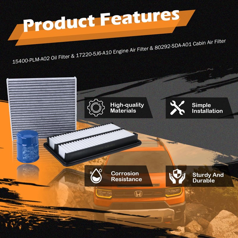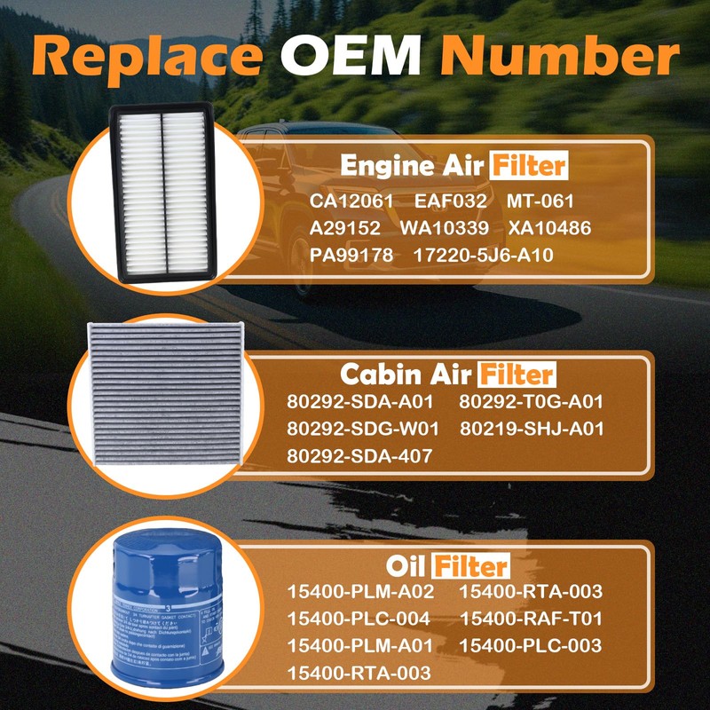 - 【Replacement Number】Engine Air Filter Replaces CA12061, EAF032, MT-061, A29152, WA10339, XA10486, PA99178, 17220-5J6-A10. Cabin Air Filter Replaces 80292-SDA-A01, 80292-T0G-A01, 80292-SDG-W01, 80219-SHJ-A01, 80292-SDA-407. Oil Filter Replaces 15400-PLM-A02.