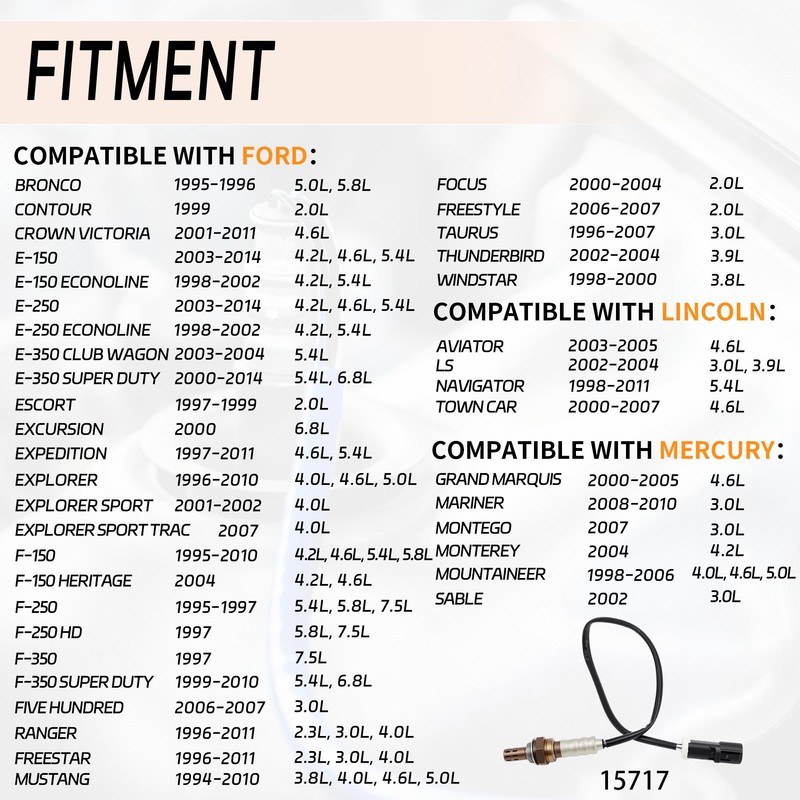 - Compatibility Information :Compatible with Ford 1990-2010 F150 | 1999-2011 F250 F350 Super Duty | 1995-1997 F250 | 1994-2010 Mustang | 1996-2011 Ranger | 1997-1999 Escort | 1997-2011 Expedition | 1996-2010 Explorer | 2003-2014 E150 | 2003-2014 E250 | 1995-1996 Bronco| 1999 Contour | 2001-2011 Crown Victoria | 1998-2002 E150 Econoline | 1998-2002 E250 Econoline | 2003-2004 E350 Club Wagon | 2000-2014 E350 Super Duty | 2000 Excursion | 2001-2002 Explorer Sport | 2007 Explorer Sport Trac | 2004 F150 Heritage | 1997 F250 HD | 2006-2007 Five Hundred | 2000-2004 Focus | 2004-2006 Freestar|2006-2007 Freestyle| 1996-2007 Taurus | 2002-2004 Thunderbird | 1998-2000 Windsta