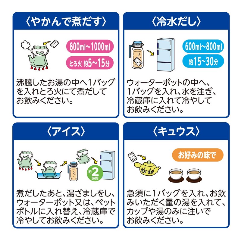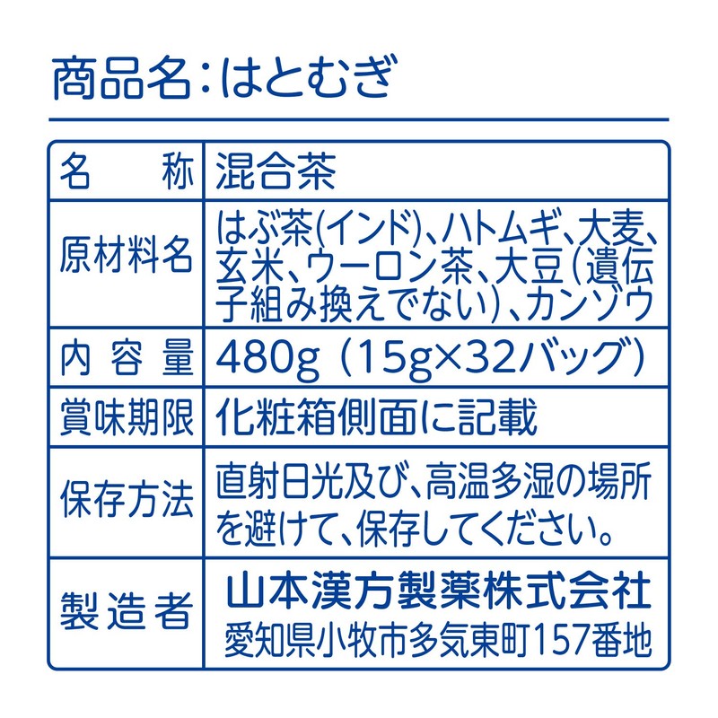 • 原材料:ハトムギ、はぶ茶、ウーロン茶、大麦、玄米、大豆、カンゾウ