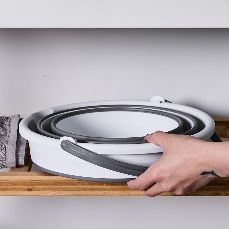 - Space-Neutral: Convenient, sturdy handle for easy carrying when filled; Handle locks in place when bucket is collapsed making it super easy to store in small and tight spaces