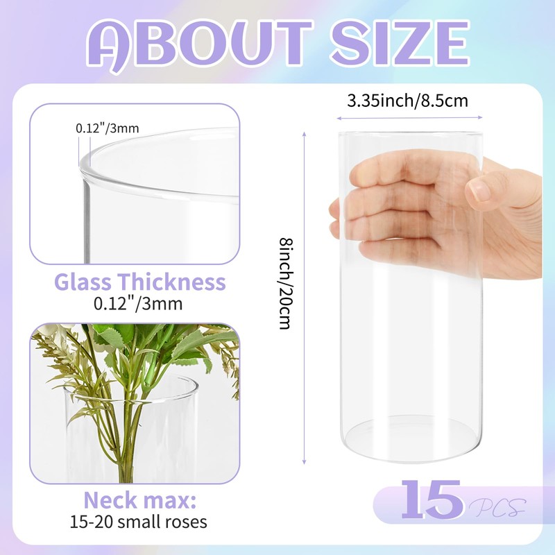 - 💐Package Including: You will get 15 pack clear glass cylinder vases with a diameter of 3.35'' and 8'' tall. suitable size and sufficient quantity, enough for your daily use. The clear vases for centerpieces are not only great for holding fresh flowers, they can also be used as floating candle holders. They are a perfect accent to a simple or complex arrangement.