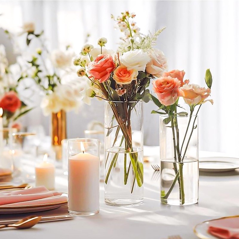 The clear glass cylinder vases can be filled with fresh flowers, dried flowers, pillar candle, floating candles, succulents, roses, pebbles, lucky bamboo, succulents and more, they can be also liquid filled and can be applied for interior and exterior decoration.