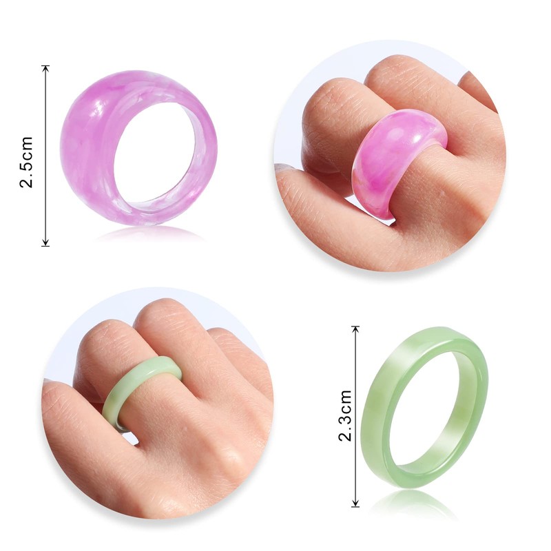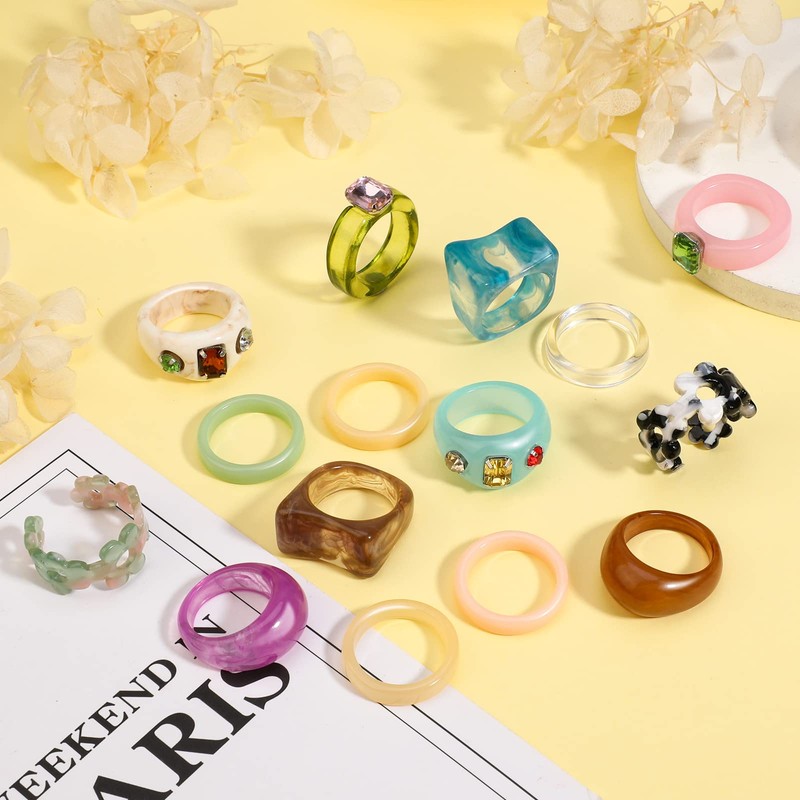 Chunky acrylic resin rings will make you look more charming and eye-catching.