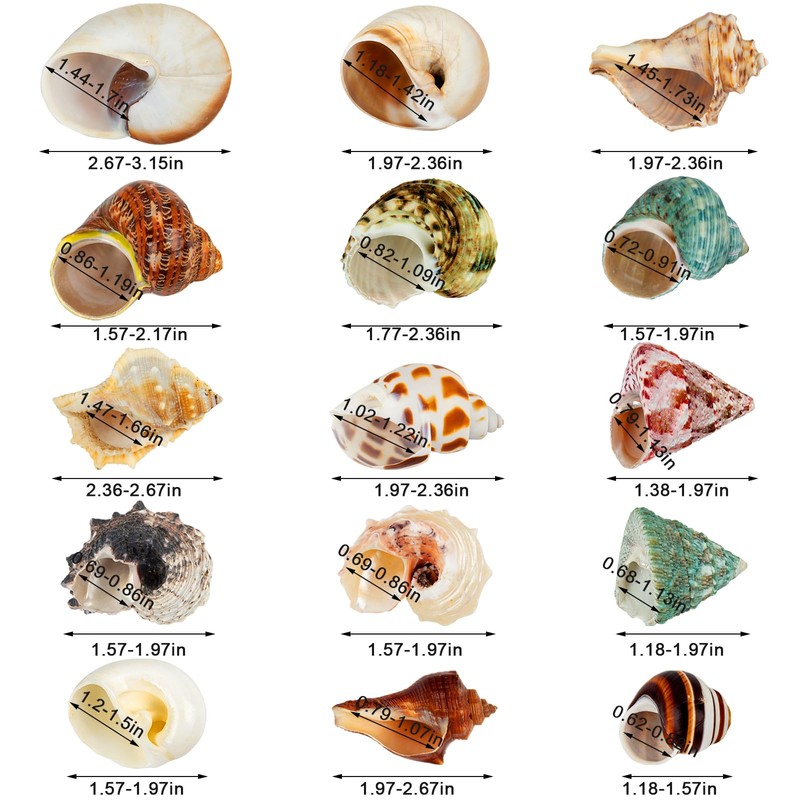 - 【15PCS Large Medium Small Shells】Our package includes 15 high-quality hermit crab shells, ranging in sea conch size from 1.6 to 3.2 inches, opening Size:0.6 - 1.8 inches. Each shell is carefully selected to provide a variety of sizes within this range, ensuring a perfect fit for your hermit crabs.