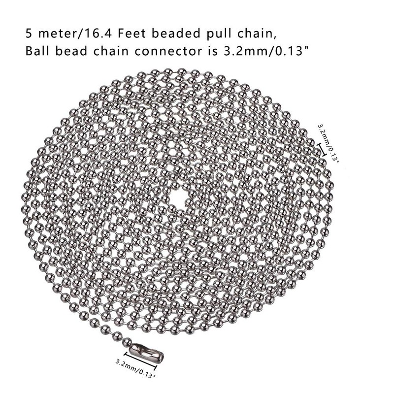 - Size: 5 meter/16.4 Feet beaded pull chain,diameter of ball chain keychain is 3.2mm/0.13".Ball bead chain connector is 3.2mm/0.13".Adjustable length,cut your desired length of pull chain to install on the places,which is convenient for your daily life