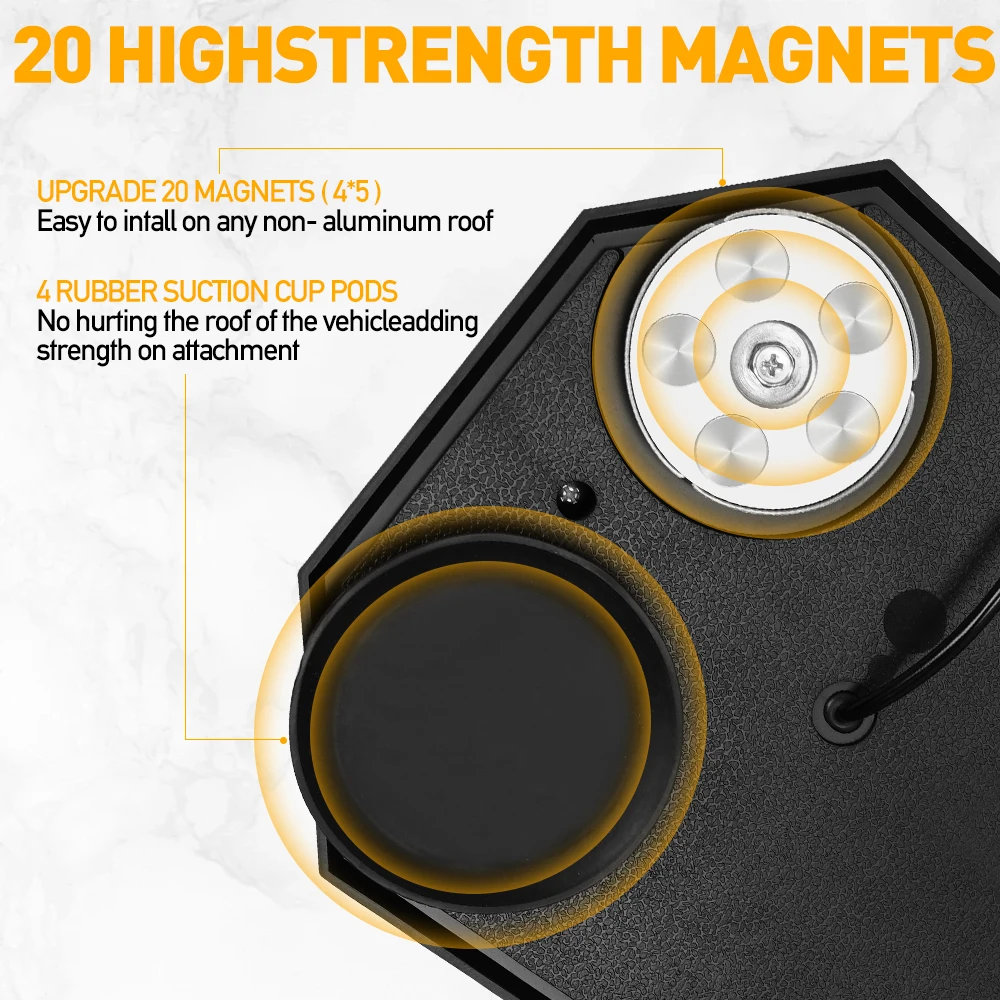 20 HEAVY-DUTY MAGNETS | The lightbar easily attaches to any metal rooftop using the 20(4*5) strong magnetic feet with rubber padding, without hurting the roof of your vehicles (Test go up to 80mph but not fall off). 9.8ft cigarette lighter adapter cable and 9.1 controller cable, long enough to install the light anywhere in the vehicles. |