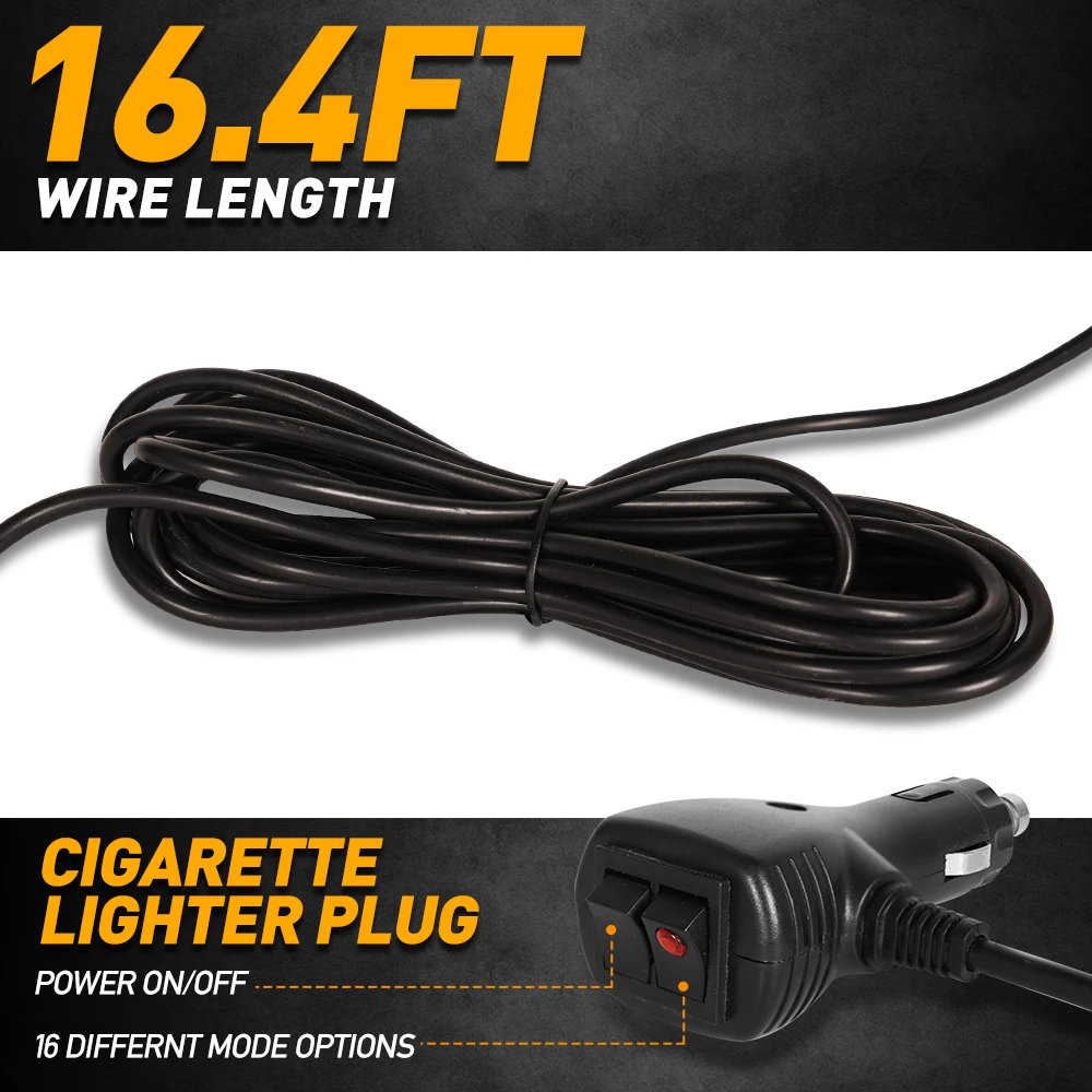 20 FLASHING PATTERNS | Double switch buttons setting, 20 Patterns to choose from, including 3 traffic modes, You can switch ON/OFF or select the flashing mode conveniently at the cigarette lighter plug buttons. Last used pattern recall/memory function. Whether you need a steady light, fast strobes, alternating patterns, or synchronized flashes, this hazard caution light bar has you covered. |