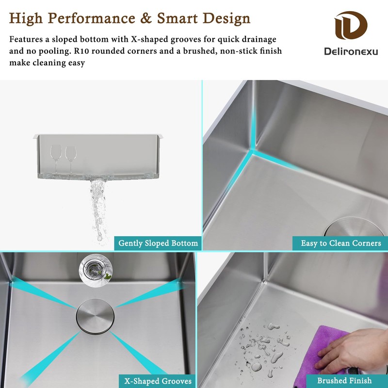 - 【Fast Drainage & Easy to Clean Bar Sink】:This undermount bar sink features a gently sloped bottom and X-shaped grooves for fast water flow, preventing pooling and ensuring complete drainage. The R10 tight-radius corners make cleaning effortless, with no hard-to-reach spots. The commercial-grade brushed finish on the bar sink hides scratches and keeps it looking new longer. Designed for small kitchen sink and rv kitchen sink area.