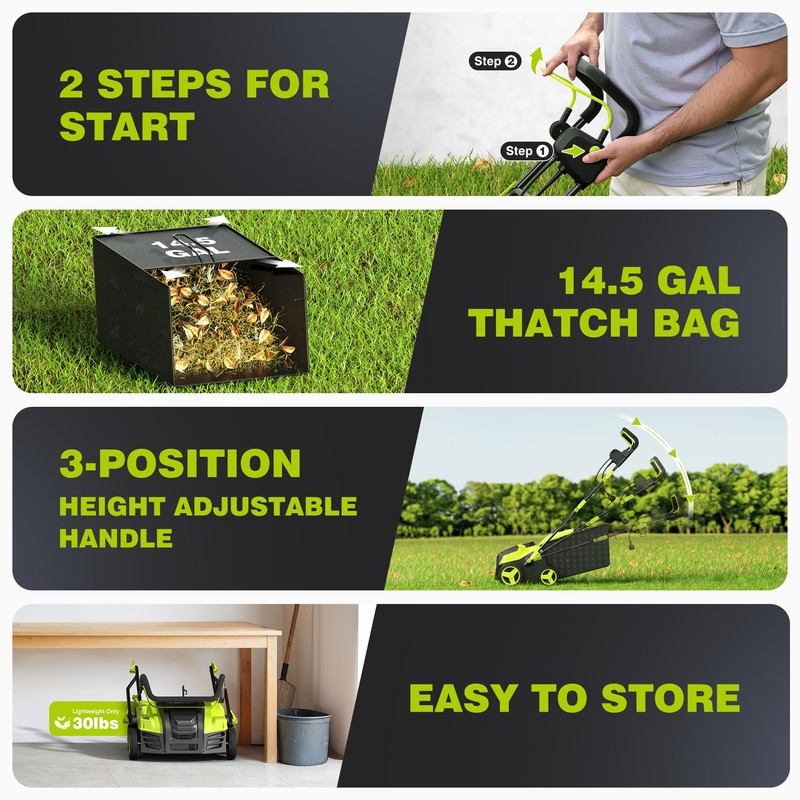 - Easy to Use: The YERYORK electric dethatcher are lighter and more affordable than traditional models, featuring a safe two-step start. It's perfect for managing small to medium-sized yards, making it an ideal choice for lawn care