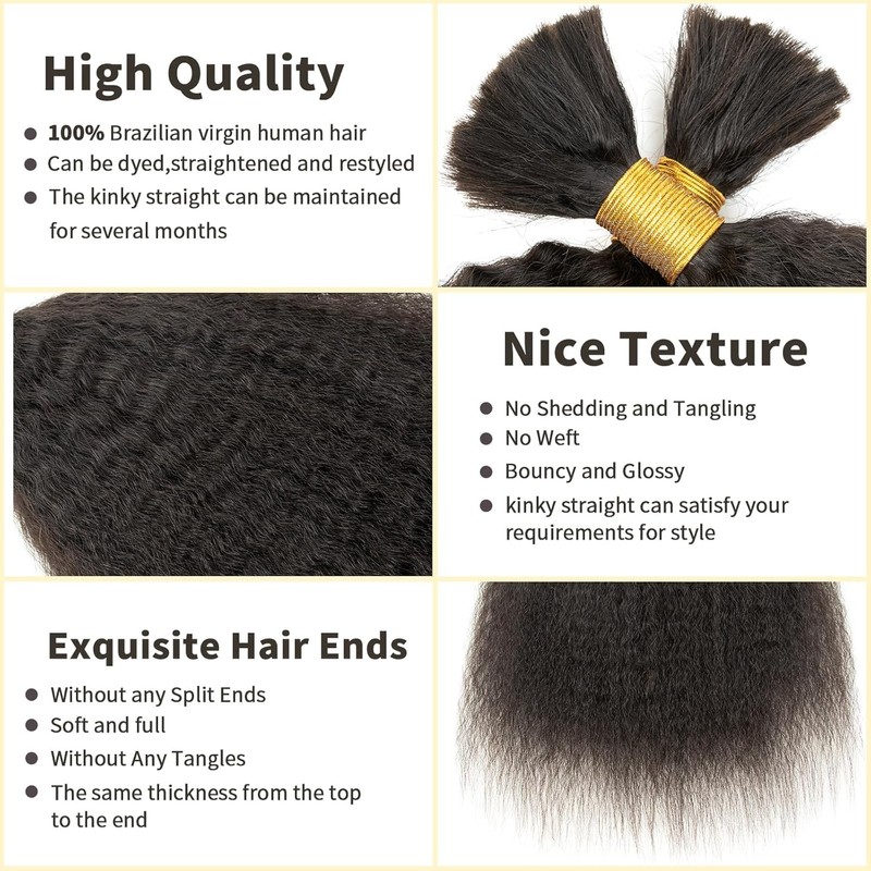 - Kinky Straight Hair Bulk Hair Quality: High Quality Bulk human hair for micro braiding no weft, Tight & Neat, Tangle & Shedding Free, Elasticity & Bouncy, No louse & No smell& no lices, Can be Curled and Styled as your own hair.