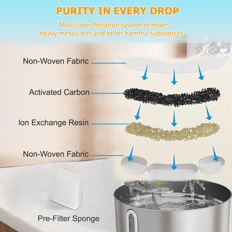 • 【5-layer Filtration System】 The replacement filter features Activated carbon(eliminates foul odors), Ion-exchange resin(filters heavy metals, softens water quality), Non-wovens fabric( isolating cat hair, food residue), Silver ion ceramic balls( remove harmful particles), built-in pump sponge (further filters debris to prevent blockages and damage.ensure your pets can drink clean and fresh water all day.