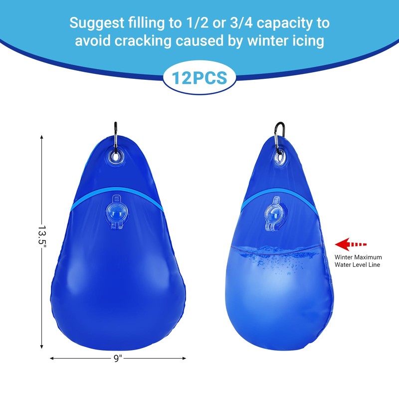 - The pool cover weights above ground inground adopts a wide mouth design, Offering rapid fill and drain capabilities,and works well with most hoses and tarp weights. Suggest filling to 1/2 or 3/4 capacity to avoid cracking caused by winter icing.