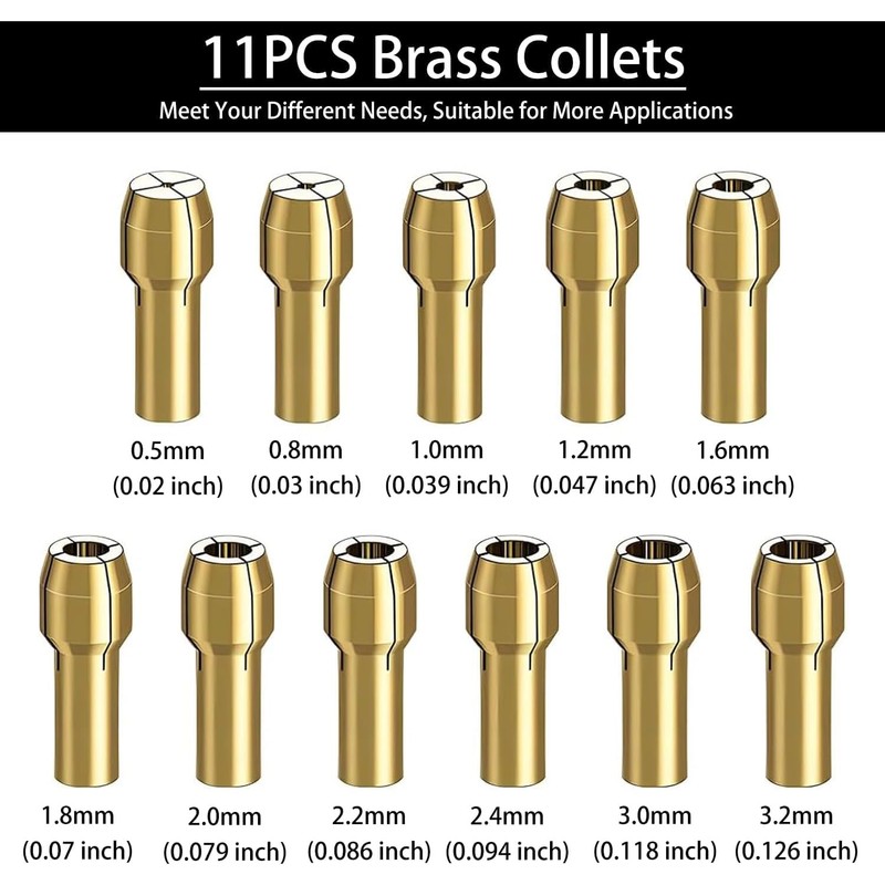 - High-quality brass collets for perfect hold: the 12 brass collets in different sizes (1/32 inch to 1/8 inch) hold burrs, grinding drums and other attachments safely and precisely. Dremel grinding attachments, dremel polishing attachments, the high-quality brass material prevents slipping even at high speeds and extends the life of your tools.