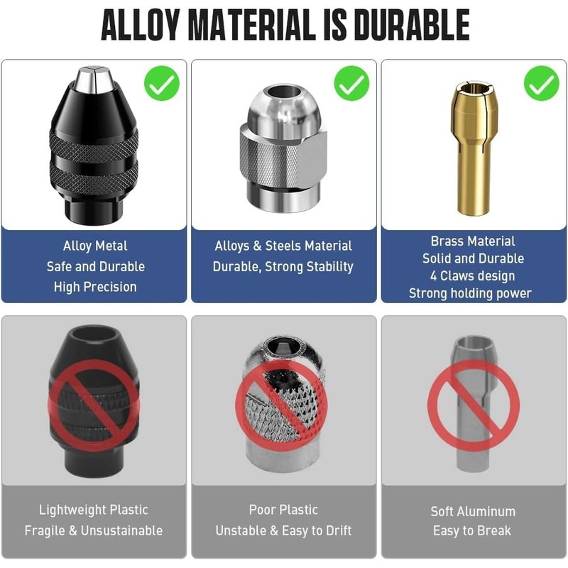 - 16 PIECE PREMIUM Dremel Tool Set Our drill chuck collet set compatible with Dremel includes 1 keyless chuck, 2 metal nuts, 12 brass collet and 1 open-end wrench. The complete kit provides everything you need for precise work with your Dremel - ideal for DIY enthusiasts and professionals alike.
