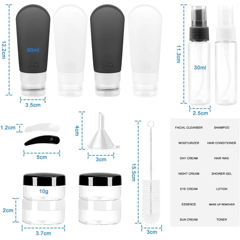 - 【Travel Bag Identifiable Label】with zipper pouch 4 bottles 4 cans 2 bottles of spray 2 spoons 1 funnel 1 cleaning brush 1 page label allows you to transport and distinguish different beauty products and cosmetics. Perfect for shampoos, conditioners, soaps, creams, lotions, moisturizers, essential oils and more.