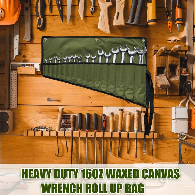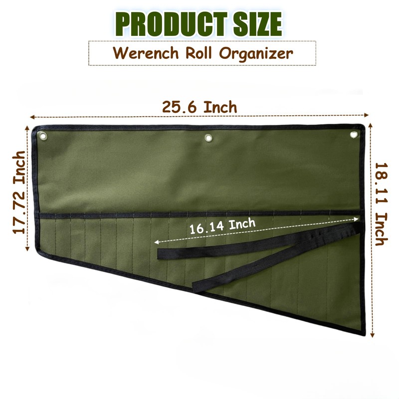 - 16 Pocket Wrench Roll Organizer: The 16 specially designed pockets are tailored to securely hold various sizes of wrenches, ensuring they stay neatly organized and easily accessible. With this organizer, you can effortlessly locate the right wrench for the task at hand, saving you valuable time and effort during your projects.