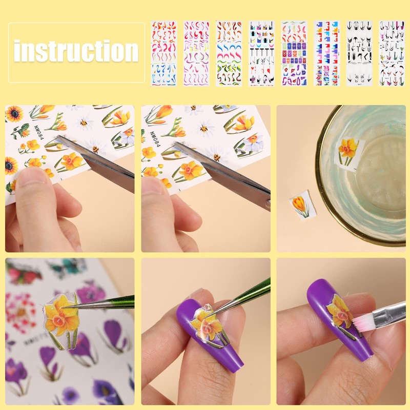 - Easy to use: 1. Cut out the desired shape and remove the film on the sticker.2. Soak it in water for 10 to 20s; 3. Grasp your nail and slide the sticker lightly onto your nail with tweezers.4. Paint the nail glue on your nail.