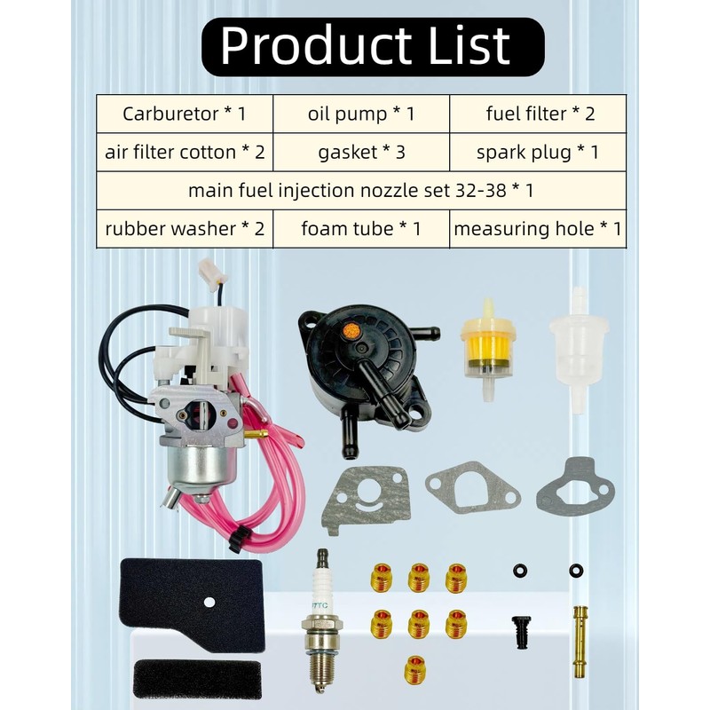 - Complete Accessories: A comprehensive set to solve the problem, including: Carburetor*1, Fuel Pump*1, Fuel Filter*2, Air Filter Cotton*2, Gasket*3, Spark Plug*1, Main Nozzle Set 32-38*1, Washer*2, Foam Tube*1, Orifice*1