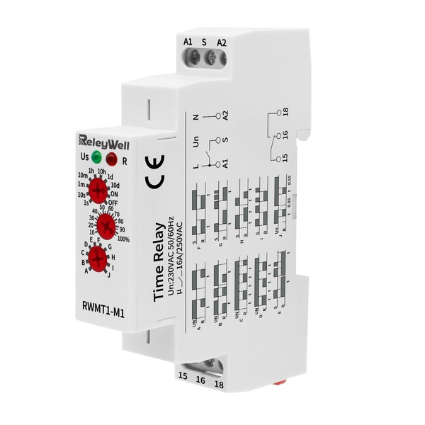 Delay Time Relay, GRT8-M1 AC DC 12V, 24V, 120V, 16A Multifunction Timer Relay with 10 Function Selections, 0.1 sec-10 Days, Delay ON Off, Din Rail Timer (M1 230VAC)