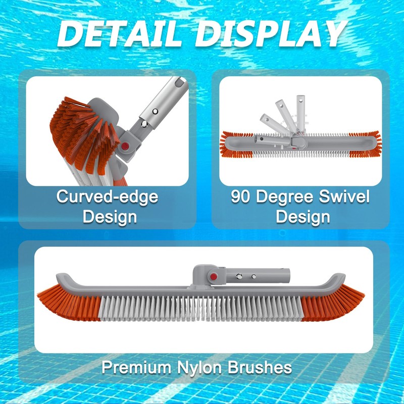 - Adjustable Premium Brush: Pool brush with pole has an adjustable brushes head, press and hold the red buttons on both sides to adjust the angle of the handle and pool brush head from 0° to 90°. Note: 90°rotation is required for first use (*not reversible adjustment) This pool brush head is made of superior quality nylon and the bristles never fall out. The 19" brush head helps you clean corners easily and effectively.