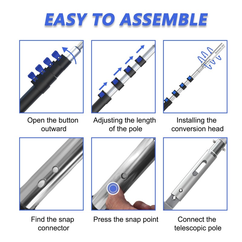 - Wide Range of Applications: SKGPOLE telescopic pool pole comes with 3/4 "American standard thread, allowing you to connect other cleaning tools when not connecting the pool pole adapter. Ideal for all your hard to reach tasks such as paint roller, squeegee, cobweb duster, ceiling fan duster, fruit picker, light bulb changer and many more home improvement adapters to use together.
