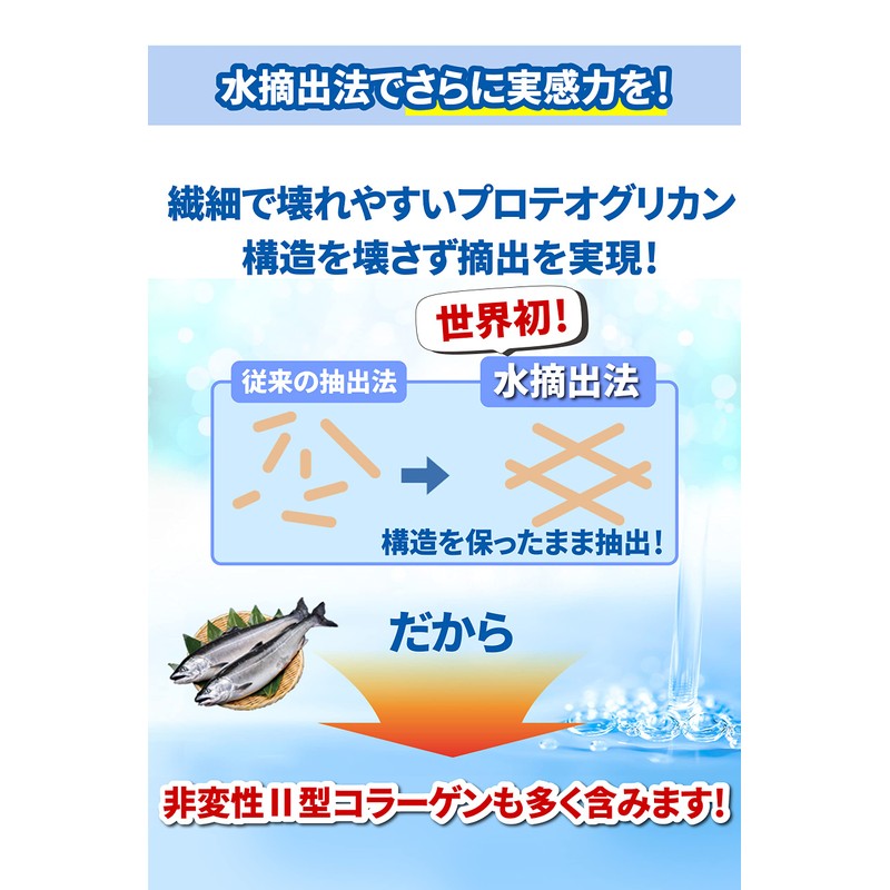 - ✅【世界初!水摘出法】私たちの体の中にあるプロテオグリカンはⅡ型コラーゲンとくっついた構造(複合体)をしています。従来のアルカリや酸で抽出する方法ではこの構造を壊してしまいましたが、構造を壊わさずに抽出することに世界で初めて成功したのが生体類似型プロテオグリカンなのです!人が持っているものに近い形状で維持することにより、胃酸や熱の影響を受け難く、粘度が高いので付着しやすくなります。さらに非変性Ⅱ型コラーゲンを多く含めるようになりました。
