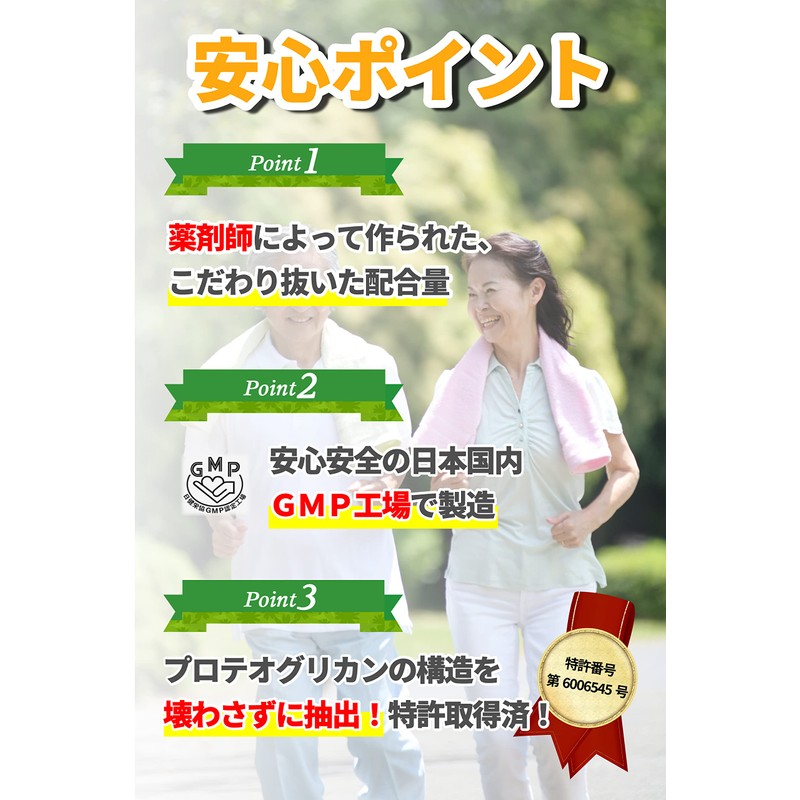 - ✅【安心安全】リアルメイトのプロテオグリカンは、お薬やサプリメントに詳しい薬剤師が、実感に導く配合量を研究し、安心・安全をモットーに製造しております。薬剤師がこだわり抜いた配合量だからこその安全と実感力です。また、日本国内で製造しているため安心!原材料の入荷から、製造・最終製品の出荷にいたるすべての過程において製品が「安全」に作られ「一定の品質」が保たれるよう定められている国内の健康補助食品GMP工場にて製造しております。