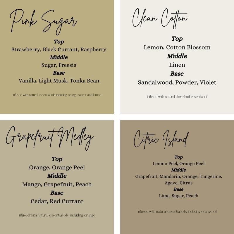 Each scent is available in candle form, allowing customers to enjoy the benefits of the product in a different way. For more information on our scented powder, please visit our Candle Listing Page.