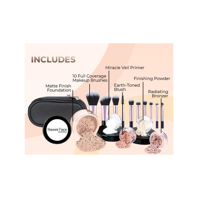 • All-in-One 16pc Light Tan Kit – Includes matte mineral foundation, veil primer, blush, bronzer, finishing powder, and a 10-piece brush set.