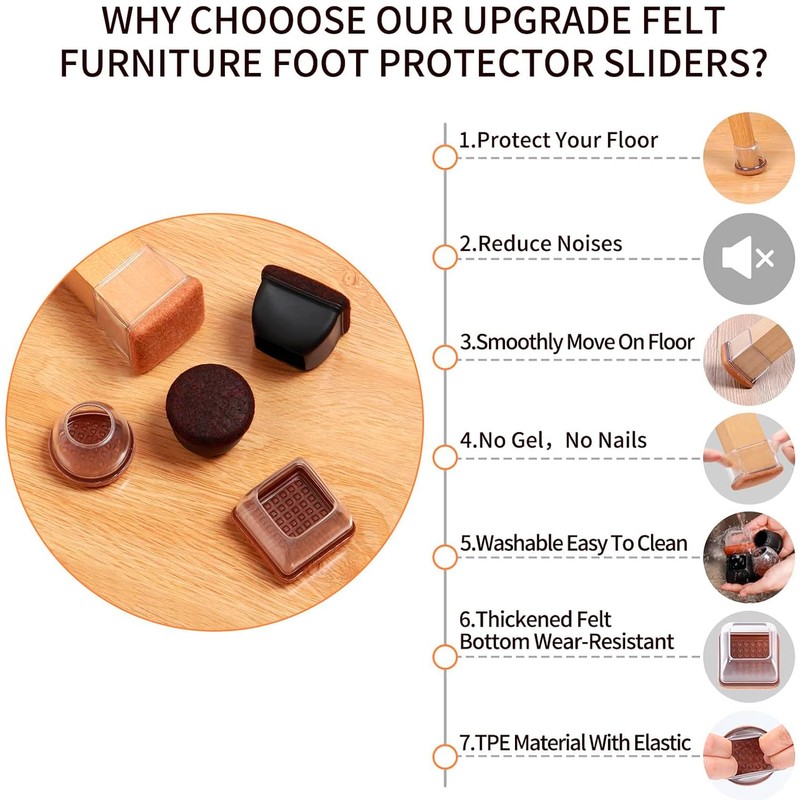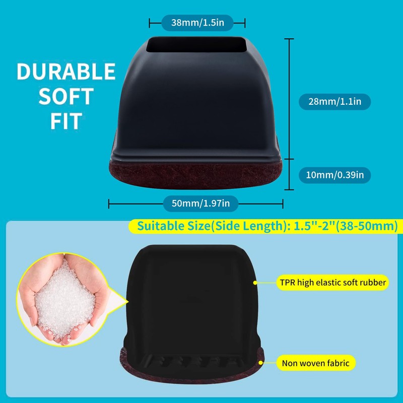 - 【APPLICABLE SIZES AND SHAPES】Our felt chair leg floor protectors have 3 shapes(square, round, rectangular), 4 sizes(S, M, L, XL), and 2 colors(clear and black) are available for your choice. Please measure the size of the furniture legs before purchasing to get the right fit, snug is better than loose. This leg floor protectors for chairs fit for 1.45"-2" square furniture leg.