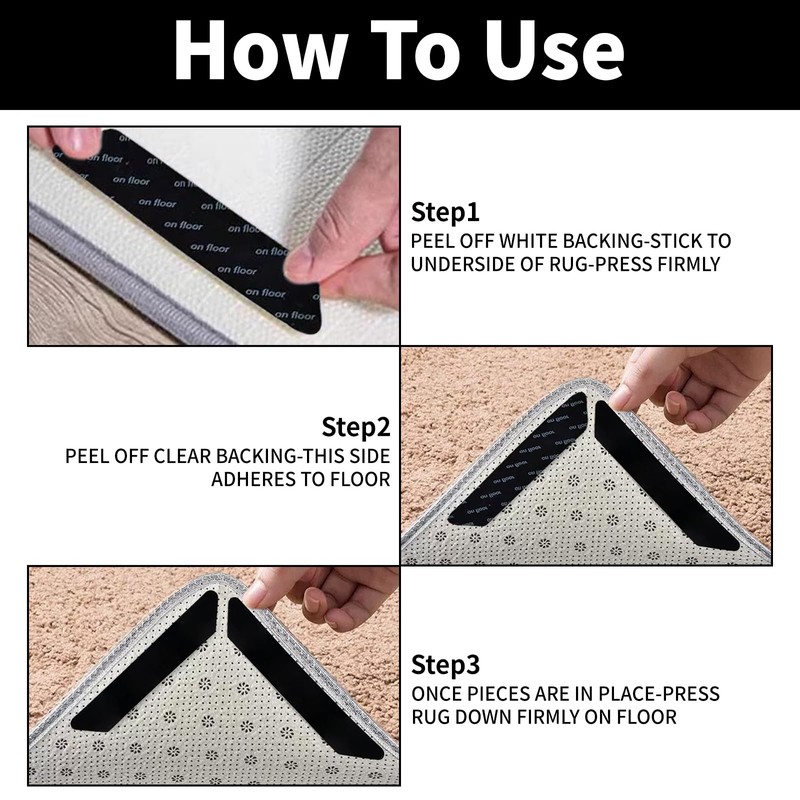 - Easy to install: Our non slip grippers for rugs come with dual-side stickers in white and clear colors. First, clean the bottom of the carpet and the floor surface. Second, peel off the white backing and stick it on the carpet. Finally, remove the transparent backing, adhere it to the floor, and press firmly