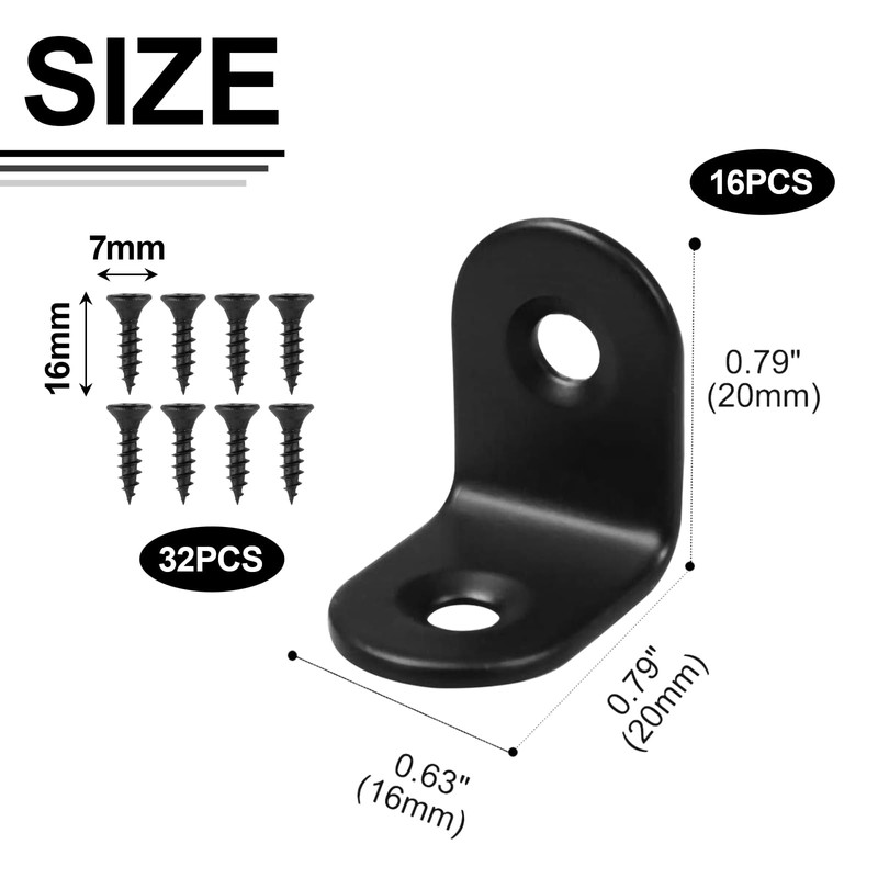 - SMALL BRACKETS SET- The package includes 16pcs small angle brackets (approx.20 x 20 x 16mm, thickness 2mm, hole diameter 5 mm × 2 holes), 32pcs screws (7 x 15mm), brackets and screws