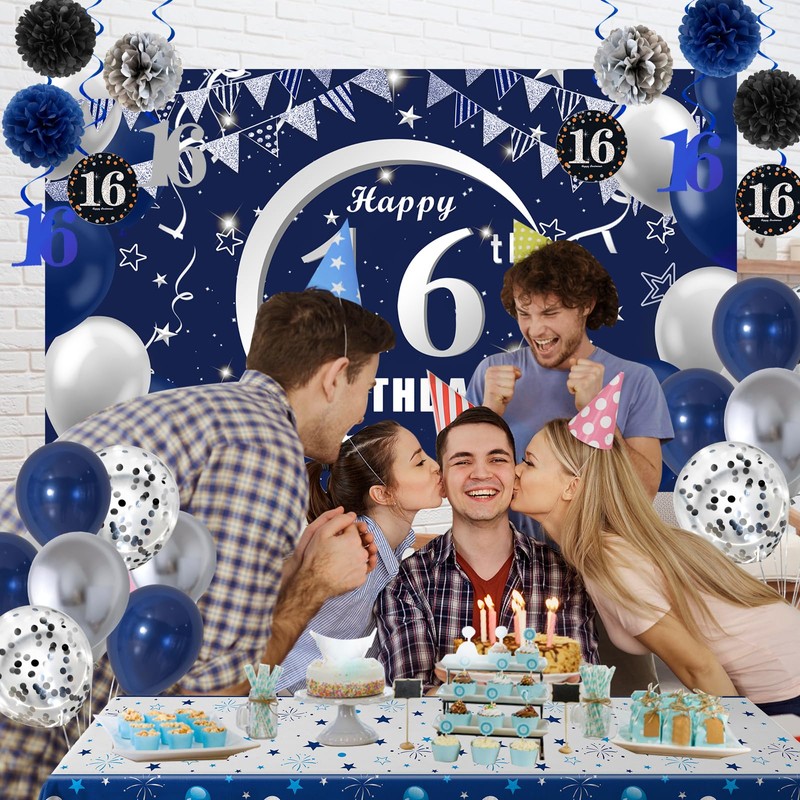- Value Package 16th Birthday Decorations for Boys Girls: 16th blue silver birthday party decorations kit includes, 1pc blue 16th happy birthday backdrop banner, 1 set 16th happy birthday flag bunting, 6pcs blue hanging swirls and 6pcs 16 birthday pendants, 15pcs blue latex balloons, 6pcs silver latex balloons, 10pcs silver confetti balloons, 1pc 16th happy birthday tablecloth, 6pcs paper pompoms, 1pc ribbon, 1pc dot glue.