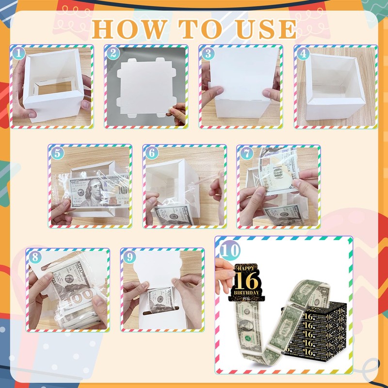 - [ What You Will Receive] You will receive a Birthday gift box, which includes 1 theme-related shaped cards (with 10 adhesive dots), 1 Product Description and a $35-sized plastic bag for easy placement of bills.