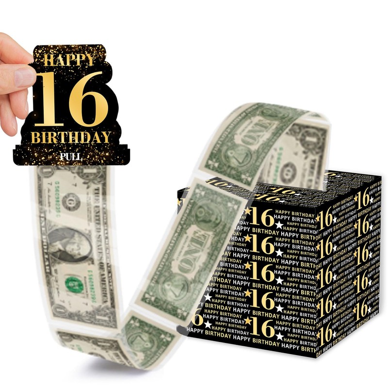 16th Birthday Party Gifts, 16th Birthday Party Decorations for Boys Girls - Black and Gold Money Pull Box for Man Women, 16 Years Old Birthday Cash Gift Ideas