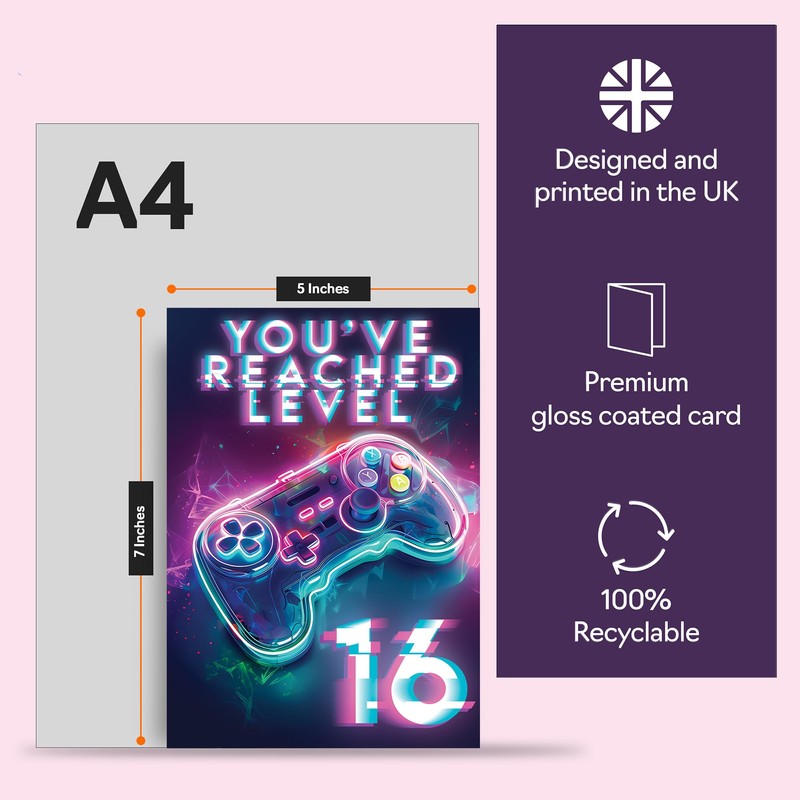 - Dazzle them with joy using our exquisite Happy Birthday Card; a premium quality masterpiece that features a captivating neon style design saying 'You've Reached Level 16'. The vibrant colours on this card make it stand out, ensuring it's not just a card but an awesome keepsake. It's a Personal Gift that shows them how much you care and the perfect way to express your appreciation on their special day.