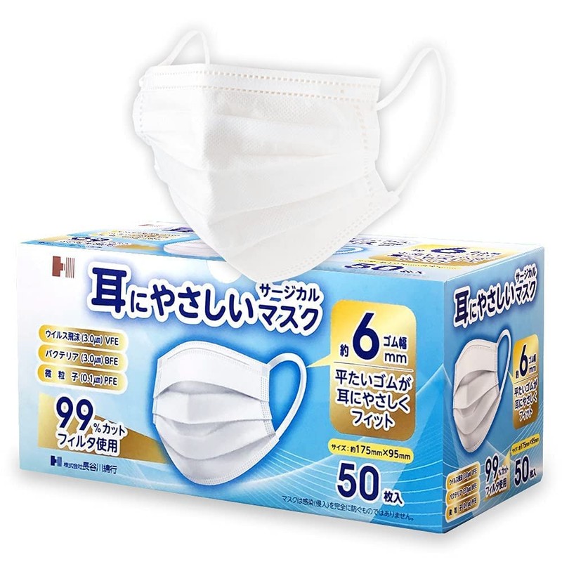 長谷川綿行 耳にやさしいサージカルマスク 不織布 17.5cm JIS規格 耳ひも6mm 普通 〜 やや 大きめ 1箱50枚