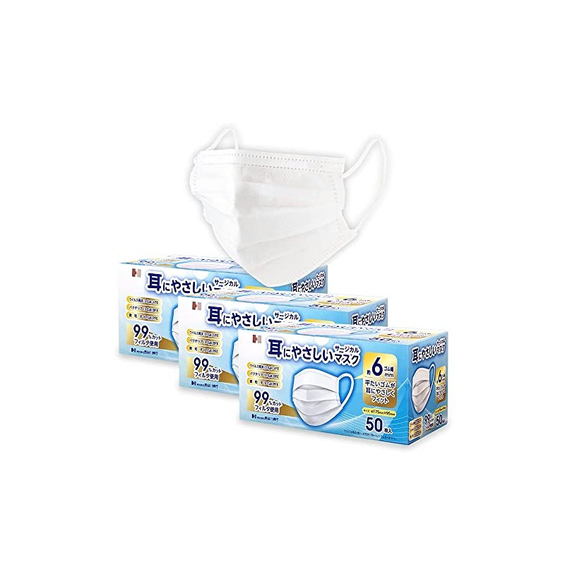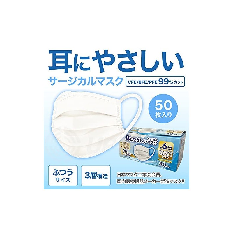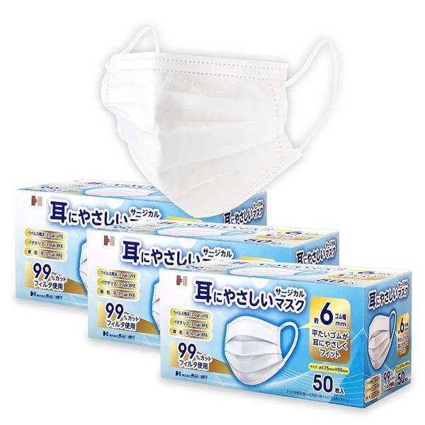 [長谷川綿行] 耳にやさしいサージカルマスク 不織布 17.5cm JIS規格 耳ひも6mm 普通 〜 やや 大きめ 3箱150枚